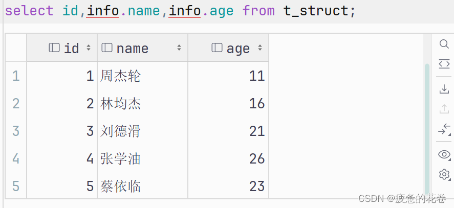 info struct<name:string,age:int> --<key:values,key:values,……>