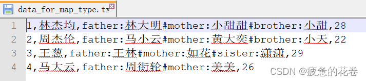 collection items terminated by '#' -- 切完后, 数据为: 1, "林杰均", ["father:林大明", "mother:小甜甜", "brother:小甜"], 28