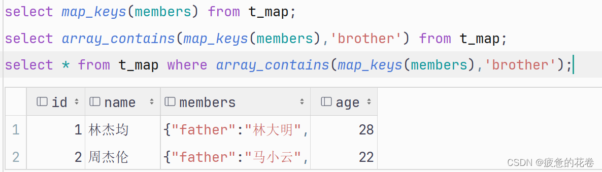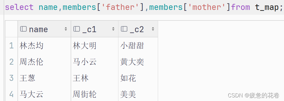 members map<string, string> comment '家庭成员', -- 左边的string: 键的类型, 右边的string: 值的类型.