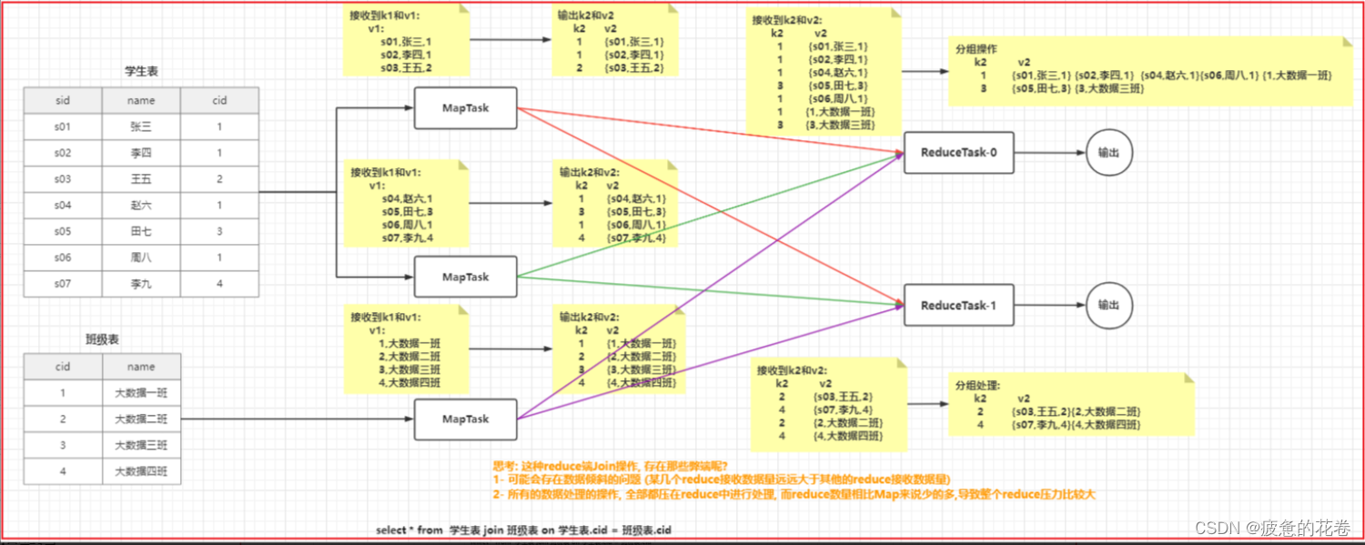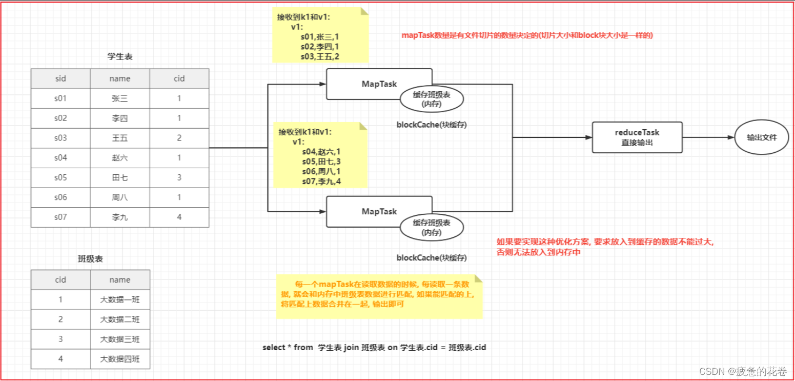 Map Join: 每一个mapTask在读取数据的时候, 每读取一条数据, 就会和内存中班级表数据进行匹配, 如果能匹配的上, 将匹配上数据合并在一起, 输出即可