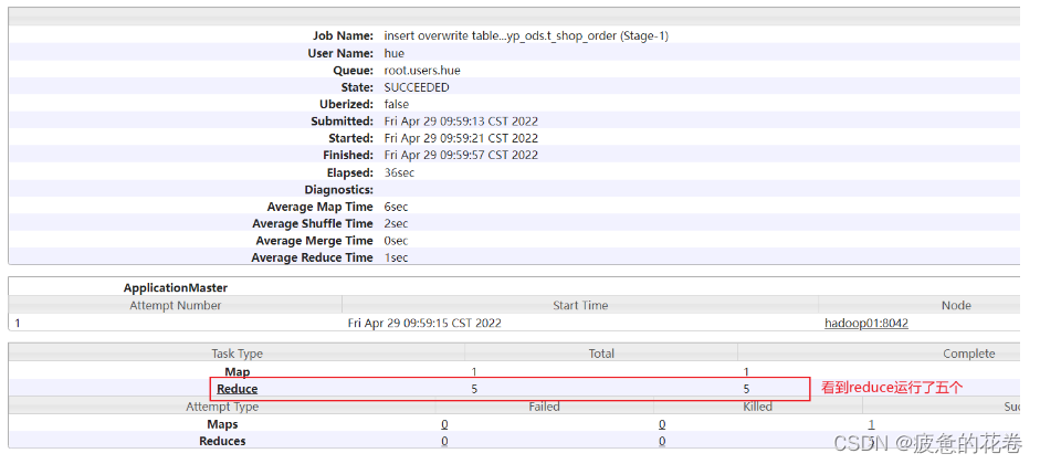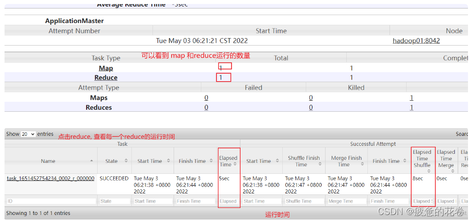 目前, 我们这里可能只有一个reduce, 但是实际上生产环境中, 此位置可能会有多个reduceTask, 我们需要观察每个reduceTask执行时间, 如果发现其中一个或者几个reduce执行时间, 远远大于其他的reduceTask执行时间, 那么说明存在数据倾斜的问题