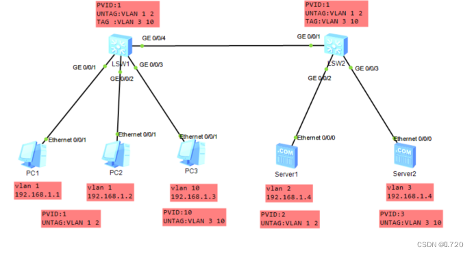 hybrid接口实验及命令理论 1.实验目的:PC 1和PC 2客户端可以相互访问,且只能访问服务器1。PC 1和PC 2客户端可以相互访问,且只能访问服务器1。PC3不能和任何pc和服务器1通信,只能访问服务器2。PC3不能和任何pc和服务器1通信,只能访问服务器2。将g0/0/3的接口pvid改为10。创建多个vlan 2 3 10。对vlan3和10打标识。创建绑定一个接口的组。不对vlan3和10打标识。不对vlan1和2打标识。链路类型为hybrid。不对vlan1和2打标识。链路类型为hybrid。链路类型为hybrid。