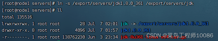 4.配置jdk软连接 命令:ln -s /export/servers/jdk1.8.0_361 /export/servers/jdk