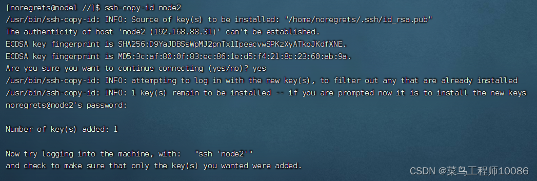 2.依次执行 ssh-copy-id node1 、ssh-copy-id node2 、ssh-copy-id node3。执行每一个命令后需要输入yes和id对应虚拟机的密码。