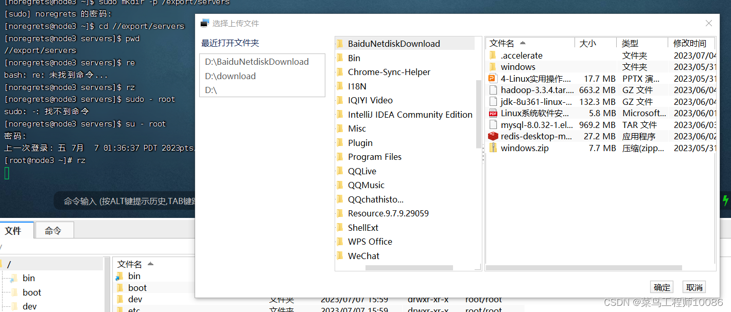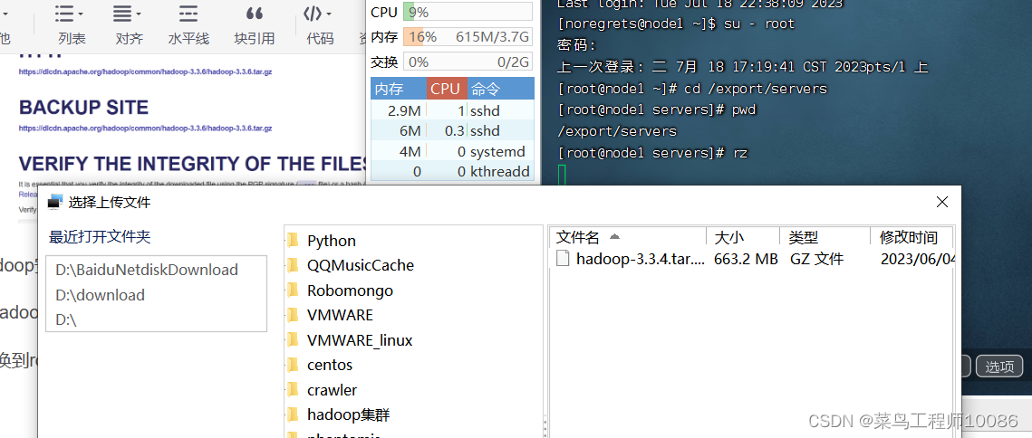 进入/export/servers目录,输入rz,选择Hadoop下载文件夹进行上传。