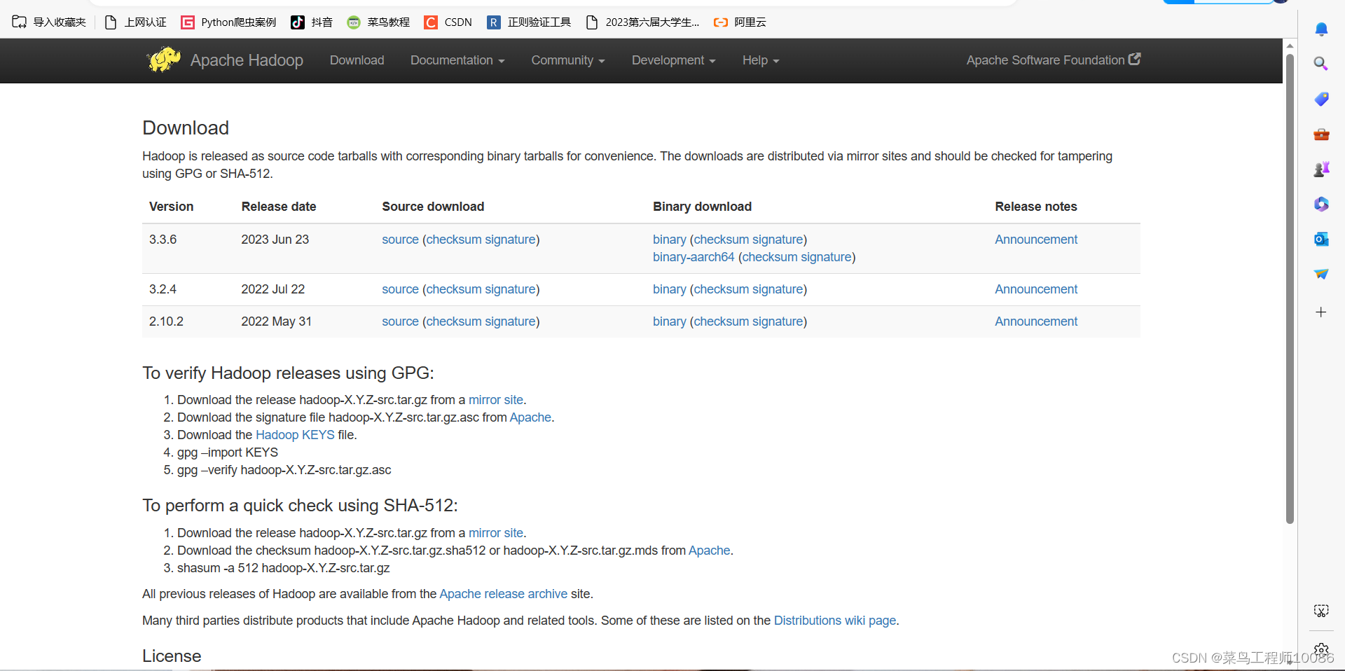 会出现好几个版本,一般第一个为最新的版本,点击3.3.6的Binary download的第一个binary,这个是Hadoop的二进制发行版本包,source download是Hadoop的源代码。