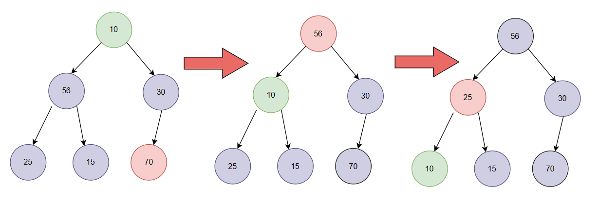 大堆的根是整棵树中最大的值,那我们就可以让根和最后一个节点进行交换(70和10进行交换),然后将剩下的节点进行调整(不包含70),调整后的根就是第二大的数。