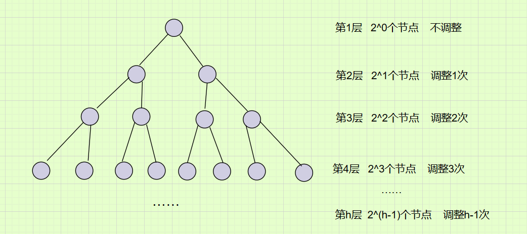 每层的数据个数 * 每层调整次数=一层最多执行的次数。那要求的是总共需要执行的次数就是每层的执行次数之和。我们设总的执行次数为T(h)。