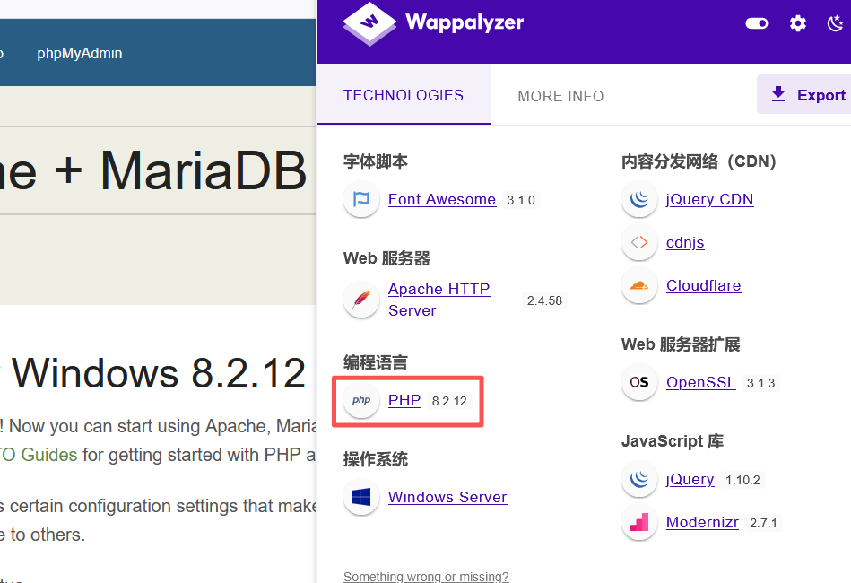 wapplyzer 指纹识别发现了 php8.2.12,存在历史漏洞,编号为:CVE-2024-4577