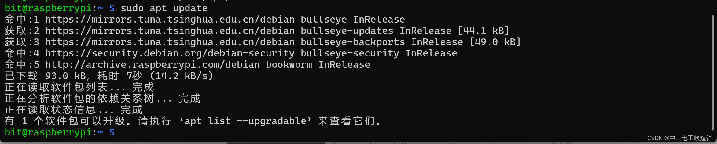 由于树莓派刚刚烧录好系统,我们先换源再更新软件源和升级所有已安装的软件包,树莓派使用官方源会很麻烦所以使用国内源