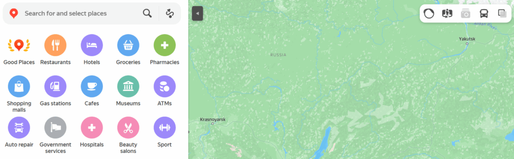 Yandex地图功能类似Google Maps,但对俄罗斯本地商户数据覆盖更全。