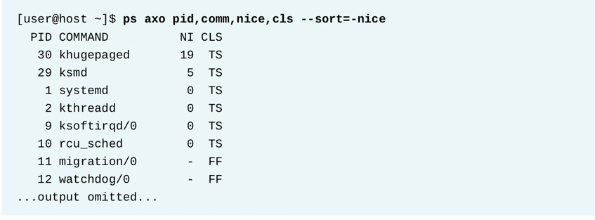 ps 命令可显示进程的 nice 值。以下 ps 命令列出所有进程,包括其 PID、进程名称、nice 级别和调度类型,按 nice 降序排列。在 CLS 调度类型这一列中显示 TS 的进程将依照 SCHED_NORMAL 调度策略运行。nice 显示为短划线(-)的进程将依照其他调度策略运行,具有较高的优先级: