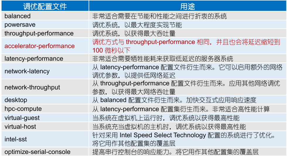 tuned 服务可基于预定义的所选调优配置文件自动修改设备设置,以满足特定的系统需求。