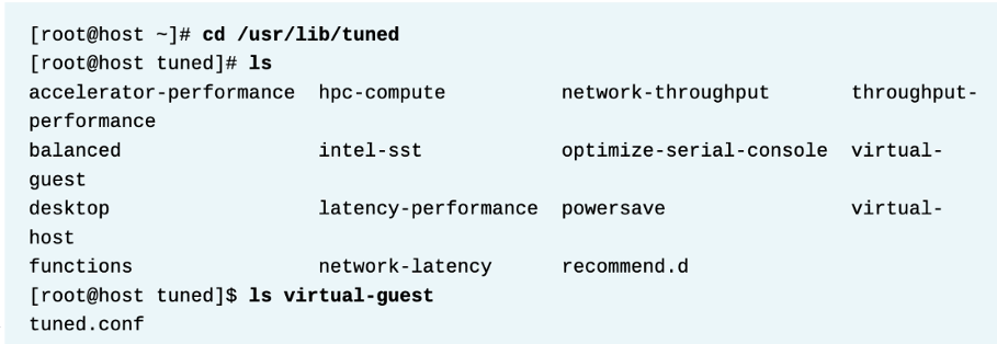 tuned 的调优配置集存储在 /usr/lib/tuned(默认)和 /etc/tuned(自定义或当前有效)目录下。每个配置集都有一个单独的目录,目录中包含 tuned.conf 配置文件及其他可选文件。切勿直接修改 /usr/lib/tuned 系统目录中的文件: