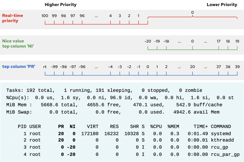 top 命令可通过交互方式查看和管理进程,可以查看 nice 值(NI)和 priority 值(PR)。nice 值 -20 映射至 PR 值 0: