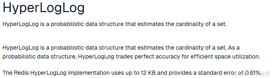 从官方文档可以看到,hyperloglog是一种概率性数据结构, 用最高不超过12kb的空间来统计集合中的基数(不重复的元素个数),且错误率保持在百分之0.81以内。假设我们有一万亿个数据,里面有重复的有不重复的,现在我们想找到这万亿个数据中有多少种数(即多少个不重复的元素),就可以使用hyperloglog。