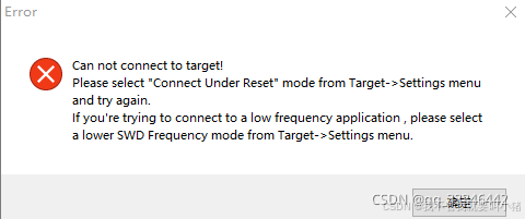 Can not connect to target! Please select "Connect Under Reset" mode from Target->Settings menu and try again. If you're trying to connect to a low frequency application , please select a lower SWD Frequency mode from Target->Settings menu.
