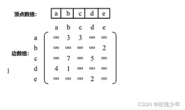 创建一个二维数组 v[5][5],将点作为下标,数组值代表这条边的权值,a=1、b=2、c=3、d=4,由图知v[1][2]=3。