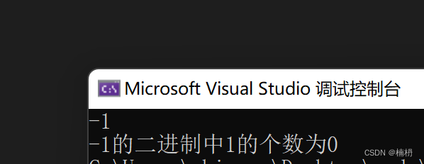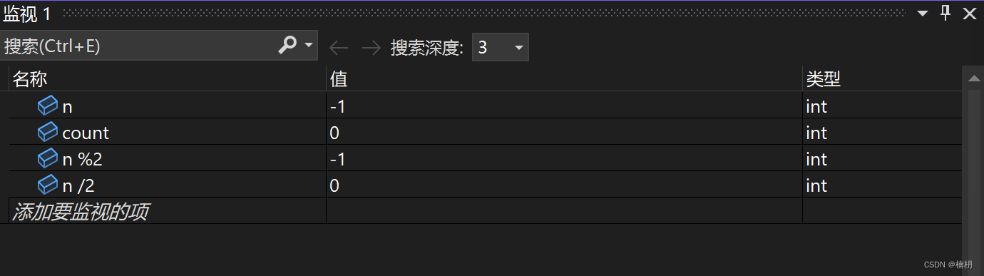 然而结果却为0,通过调试可以发现,当n为-1时,n%2的结果为-1,不等于1,count值不变,而-1/2的结果为0,此时循环退出。
