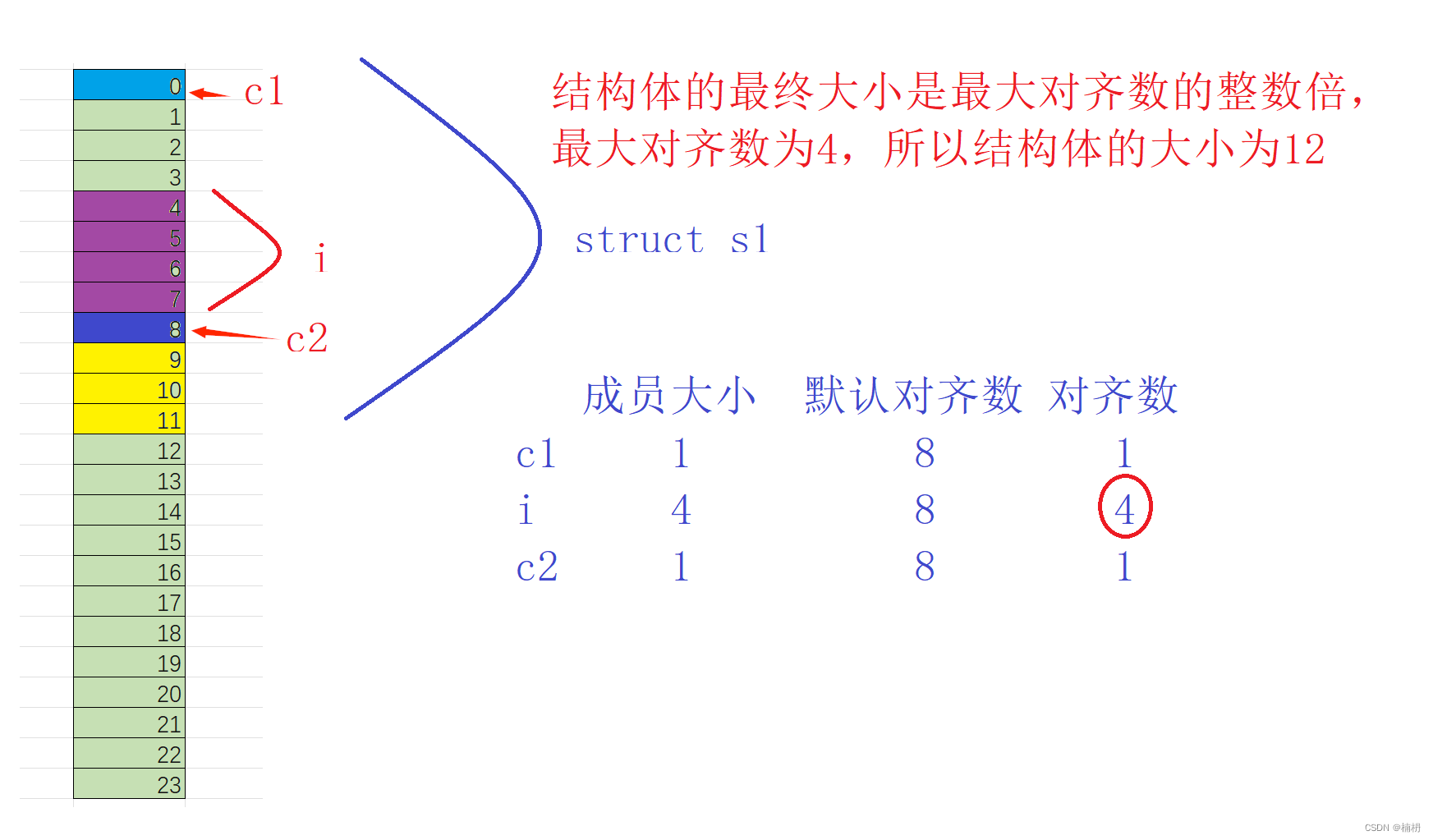 c1为char类型,占1个字节,第一个成员放在偏移量为0的位置,(char的对齐数为1)
