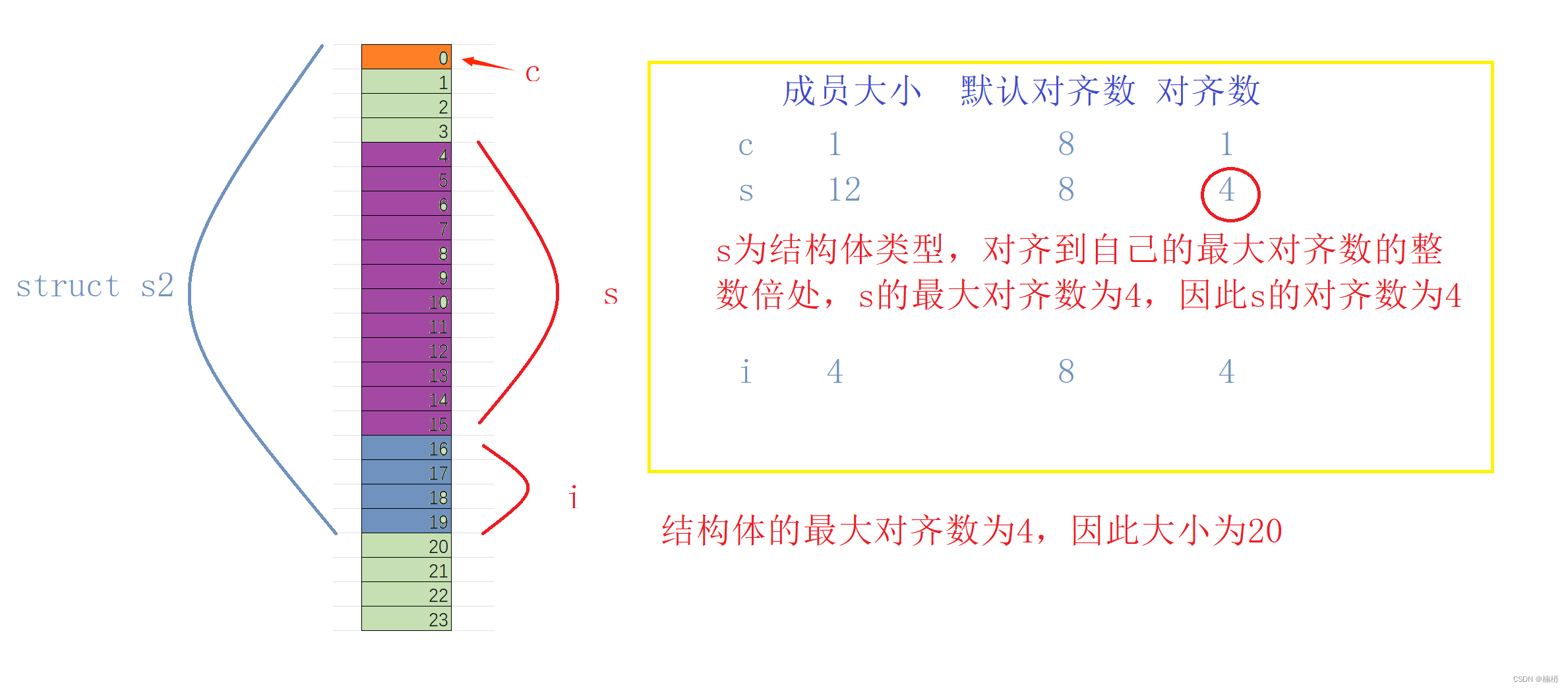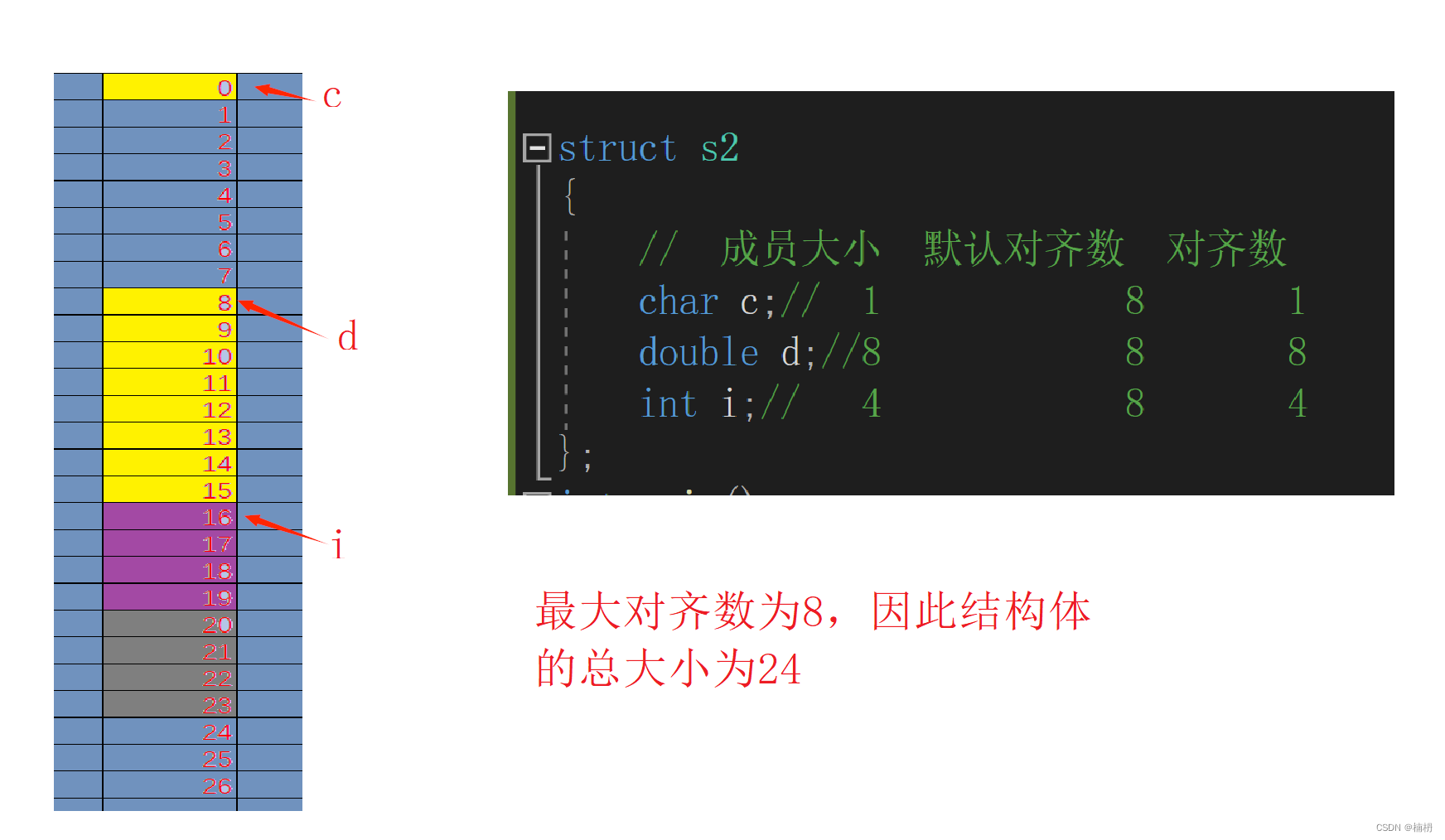 c为char类型,占1个字节,第一个成员放在偏移量为0的位置,(char的对齐数为1)
