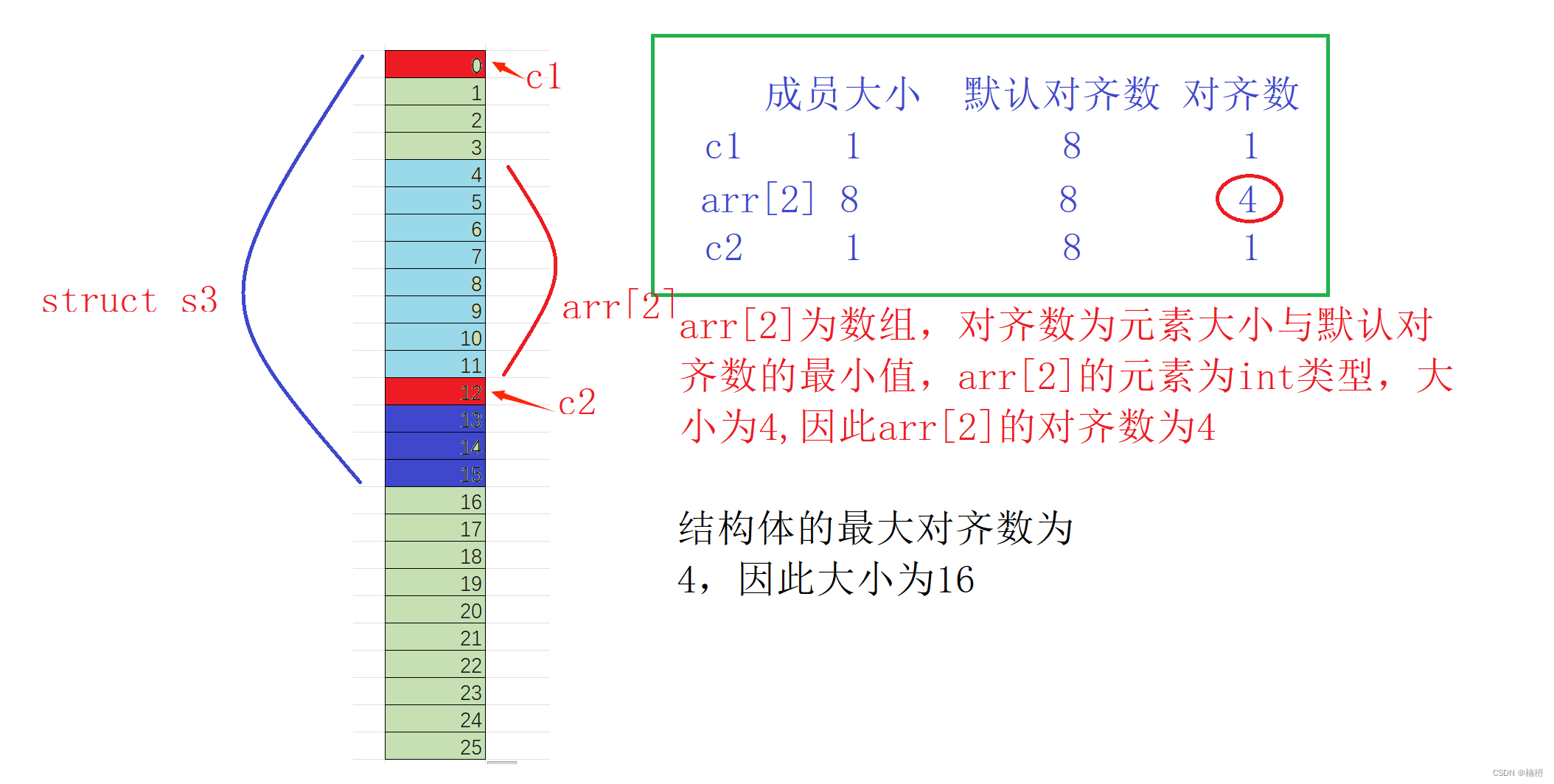 c2为char类型,占1个字节,1为c2的默认对齐数,因此在arr[2]的后面接着存放c2,放在偏移量为12的位置处