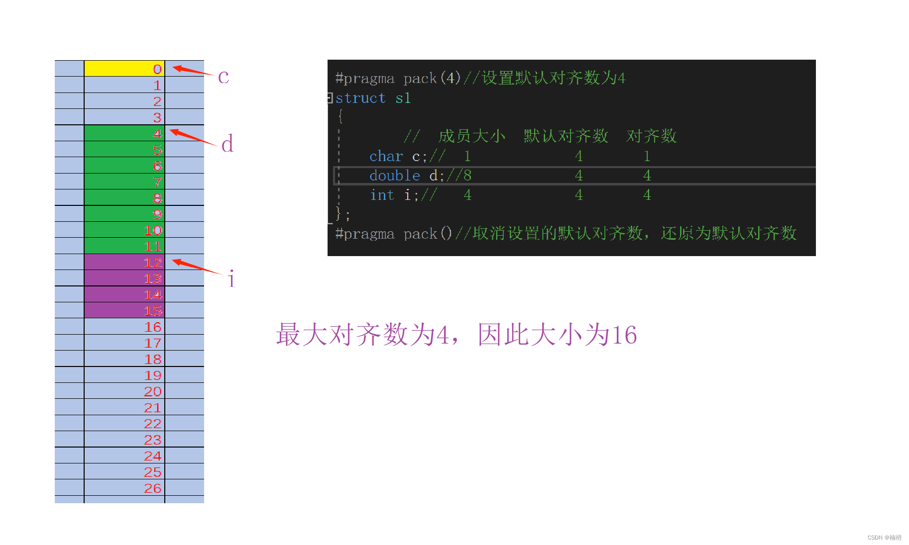 i为int类型,对齐数为4,因此对齐到偏移量为16的地址空间处。