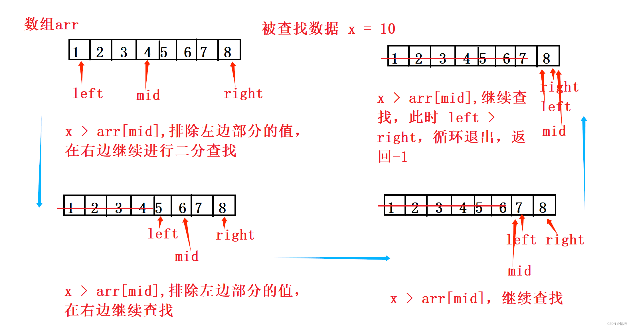 二分查找的前提是被查找的数组arr有序,通过确定中间位置mid,将数组分为两个部分,若被查找值x < arr[mid],则排除右边部分值,在左边继续进行二分查找;若x > arr[mid],则排除左边部分值,在右边继续进行二分查找;若 x = arr[mid],则找到被查找值,返回即可。