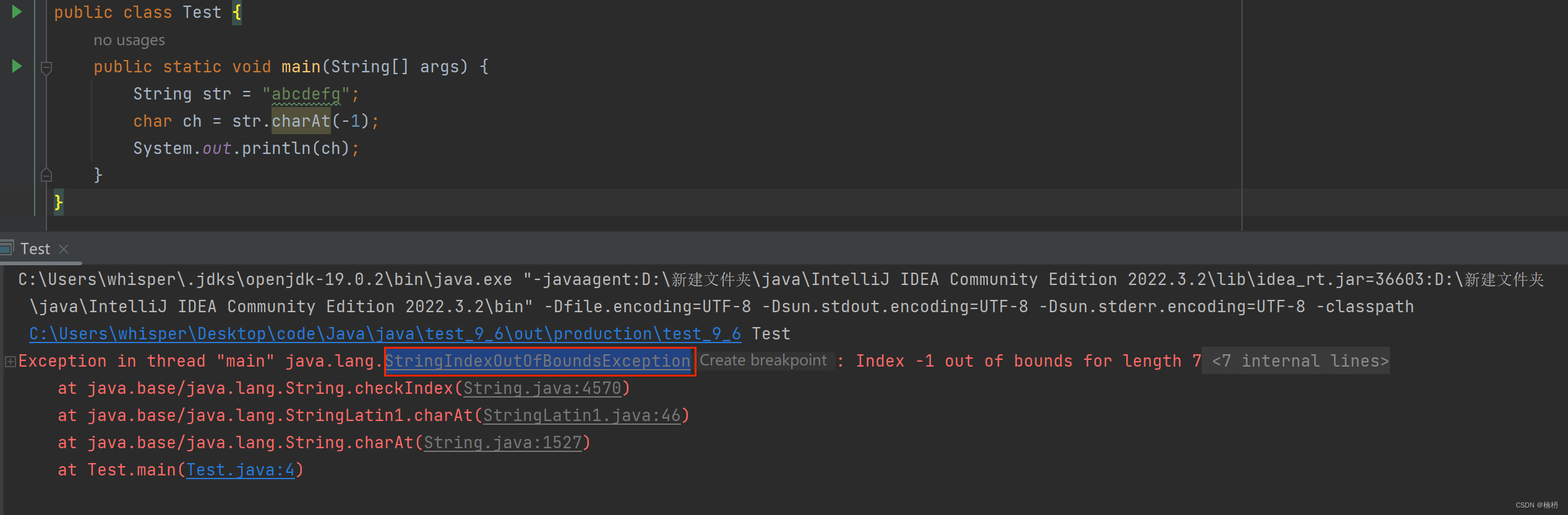 该方法返回 index 位置上的字符,若 index 为负数或是越界,则抛出StringIndexOutOfBoundsException 异常