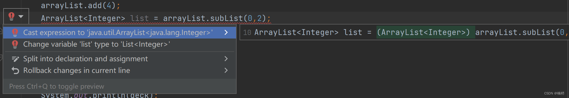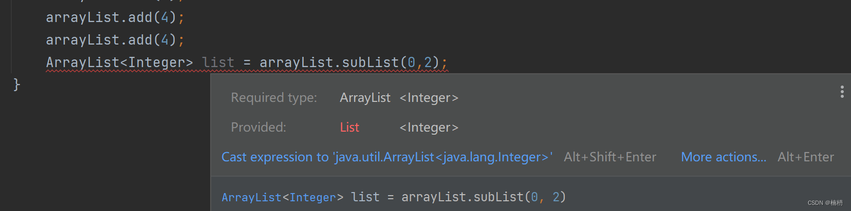 subList是List接口中定义的一个方法,用于返回集合中的一段,即从 fromIndex (包含该位置元素)位置,到 toIndex (不包含该位置元素)位置的元素,方法的返回值类型是List,且用ArrayList接收,否则会抛出 ClassCastException 异常。
