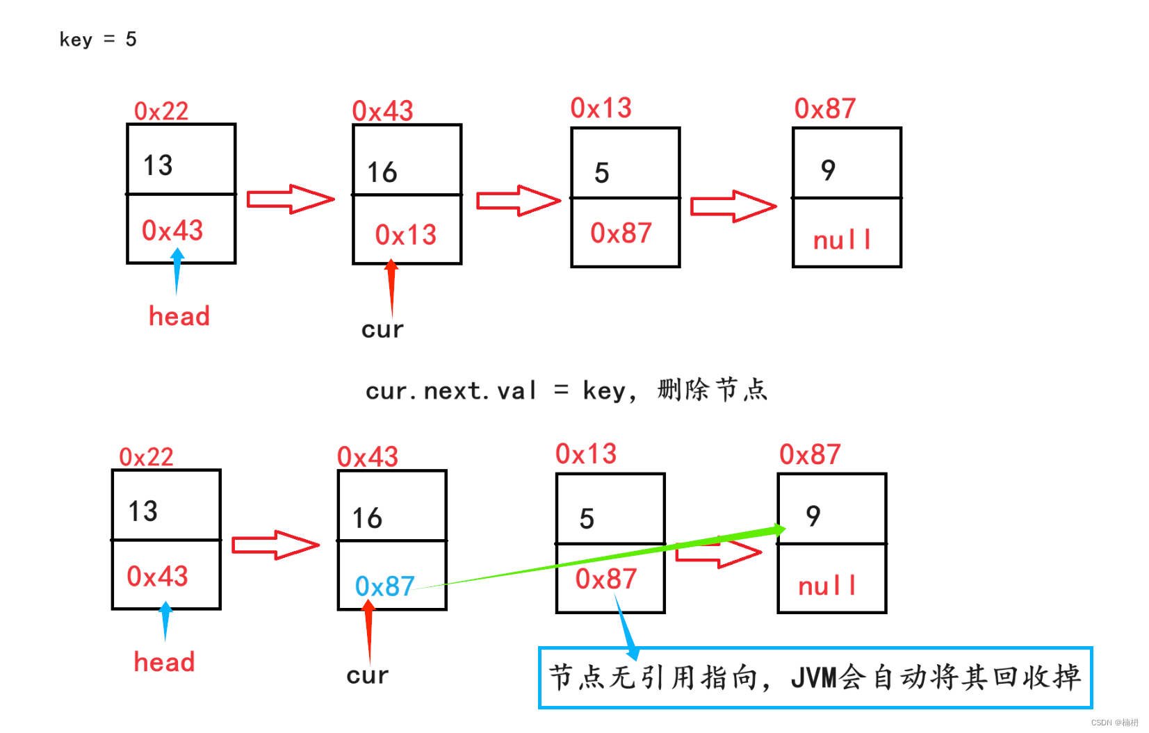 删除第一个值为key的节点:与在指定位置添加元素相同,我们需要找到第一个值为key的节点node的前驱节点,然后才能删除值为key的节点。由于JVM会将未被任何引用指向的对象回收掉,我们只需让node的前驱节点指向node的下一节点,即可实现删除