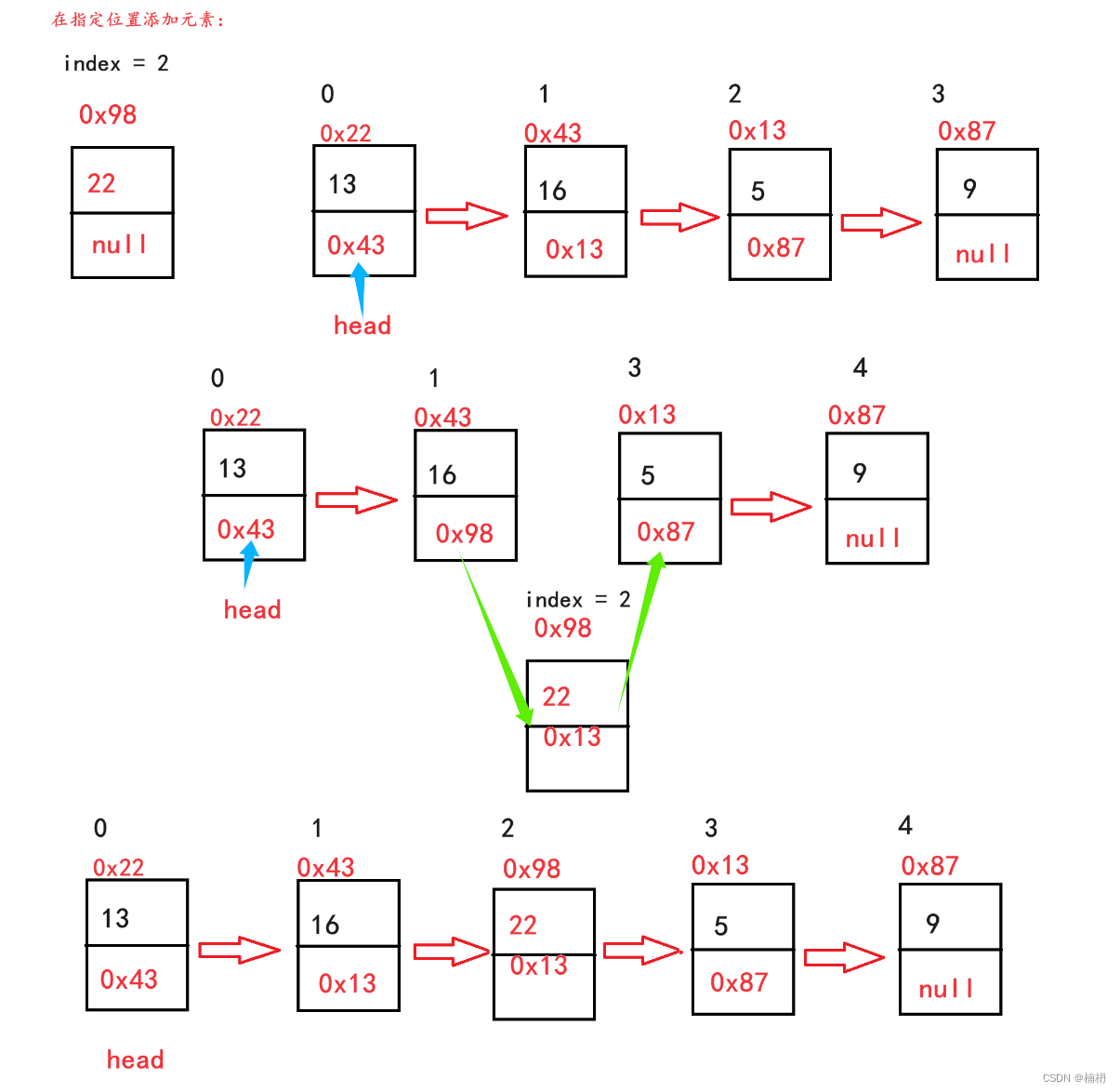 链表添加元素的方式通常有三种,头插、尾插和在指定位置添加元素。