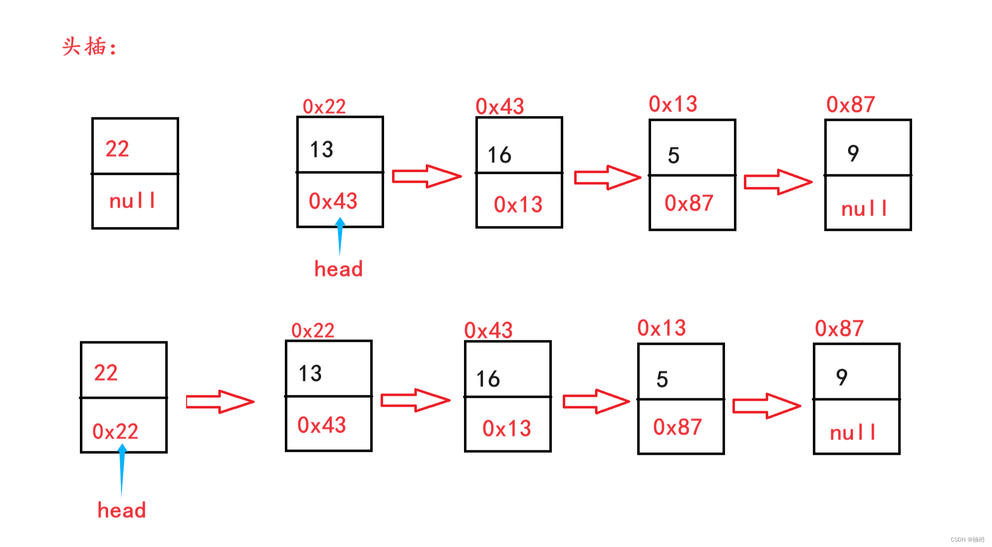实现头插,就是让要插入的节点node指向原本链表的头节点head,再更新链表的第一个节点,让head指向新插入的节点