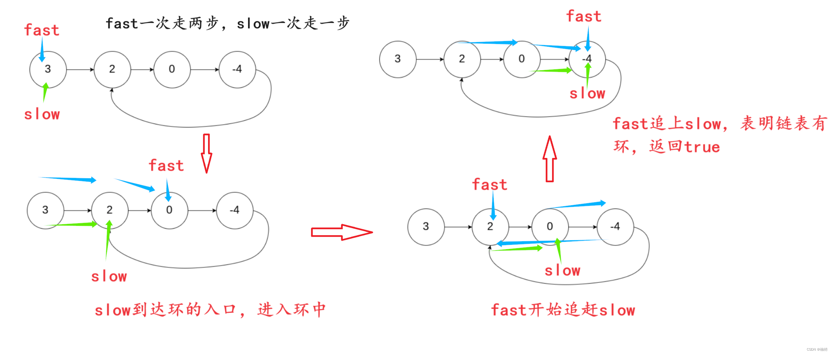 3.如果链表中无环,fast最终会指向null,若链表中有环,在fast和slow都进入环中后,由于fast每次比slow多走一步,fast最终会追上slow