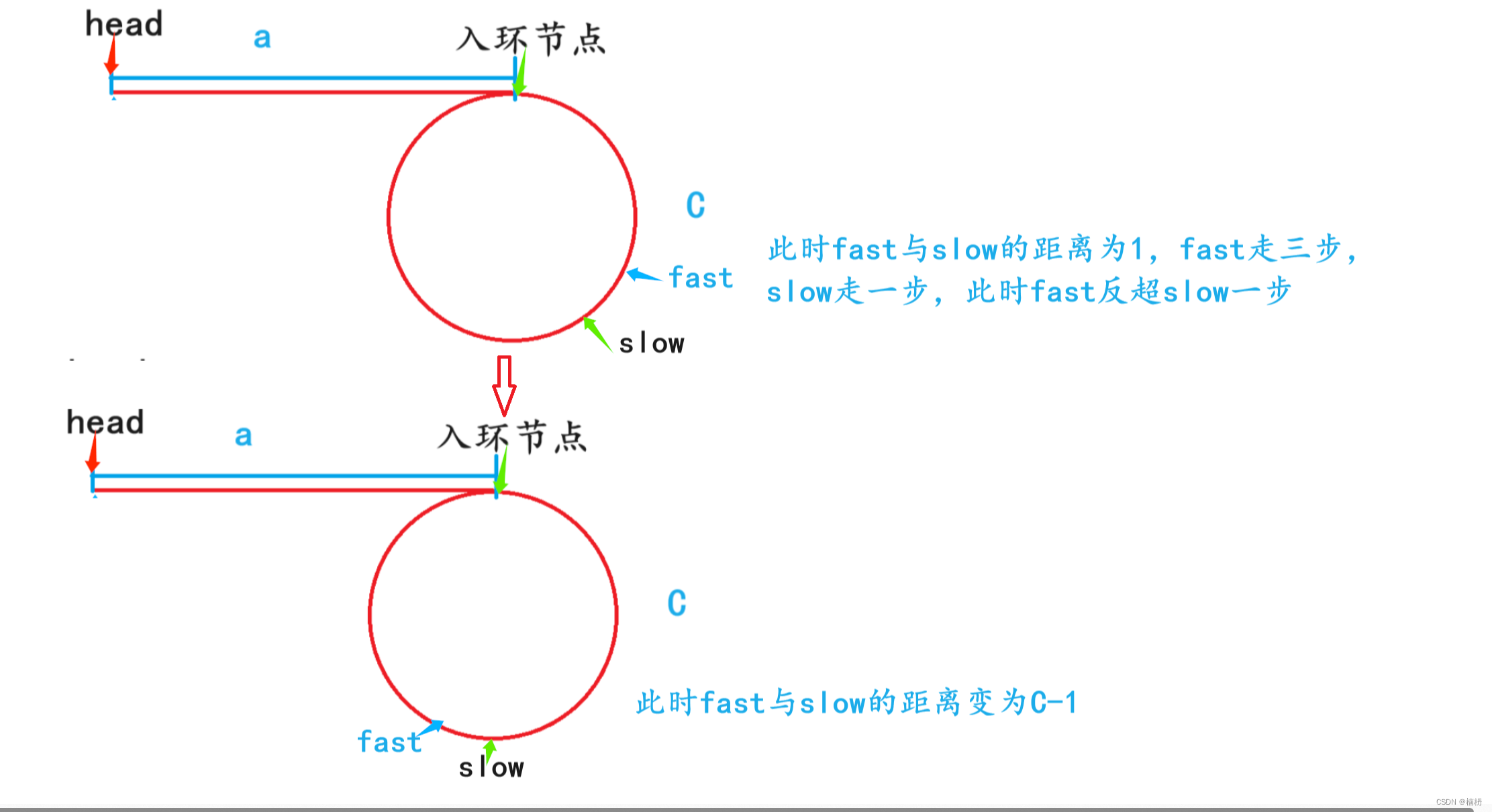 此时fast与slow的距离N变为C-1,fast重新开始追及slow,若C-1为偶数,则经过 (C-1)/2次后,fast追上slow;若C-1为奇数,在fast与slow距离为1时,fast再次反超slow,fast与slow之间的距离再次变为C-1,fast再次追及slow...如此循环,fast永远追不上slow