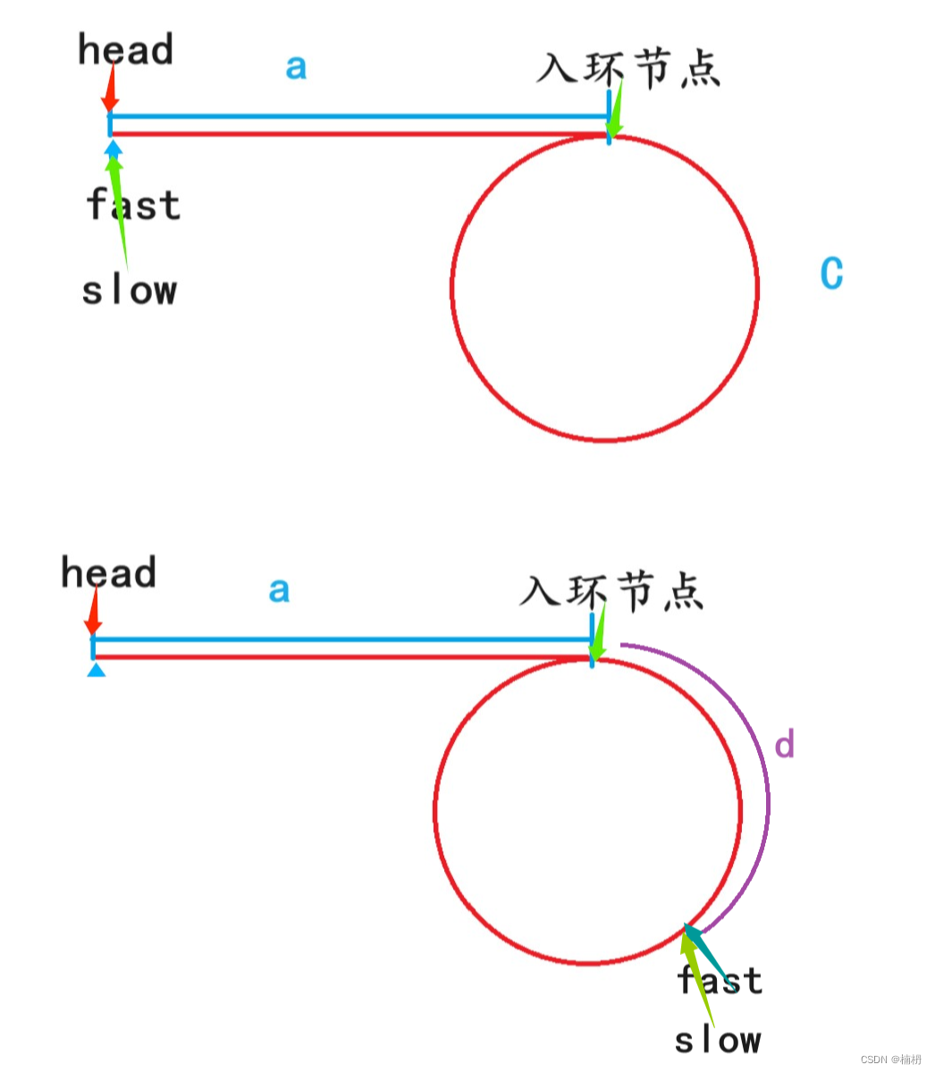 同样,当链表有环时,我们假设head到入环节点有a个节点(从head到入环节点需要走a步),环上一共有C个节点,fast与slow相遇时,与入环节点的距离为d
