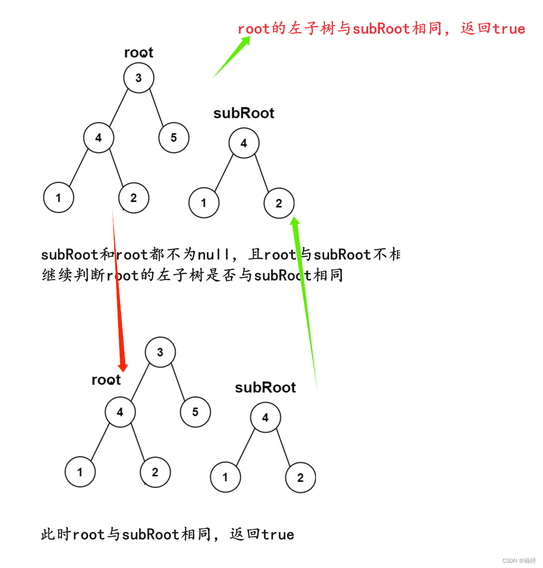 若不相同,则判断root的左子树是否与subRoot是否相同,若相同,则subRoot是root的子树;