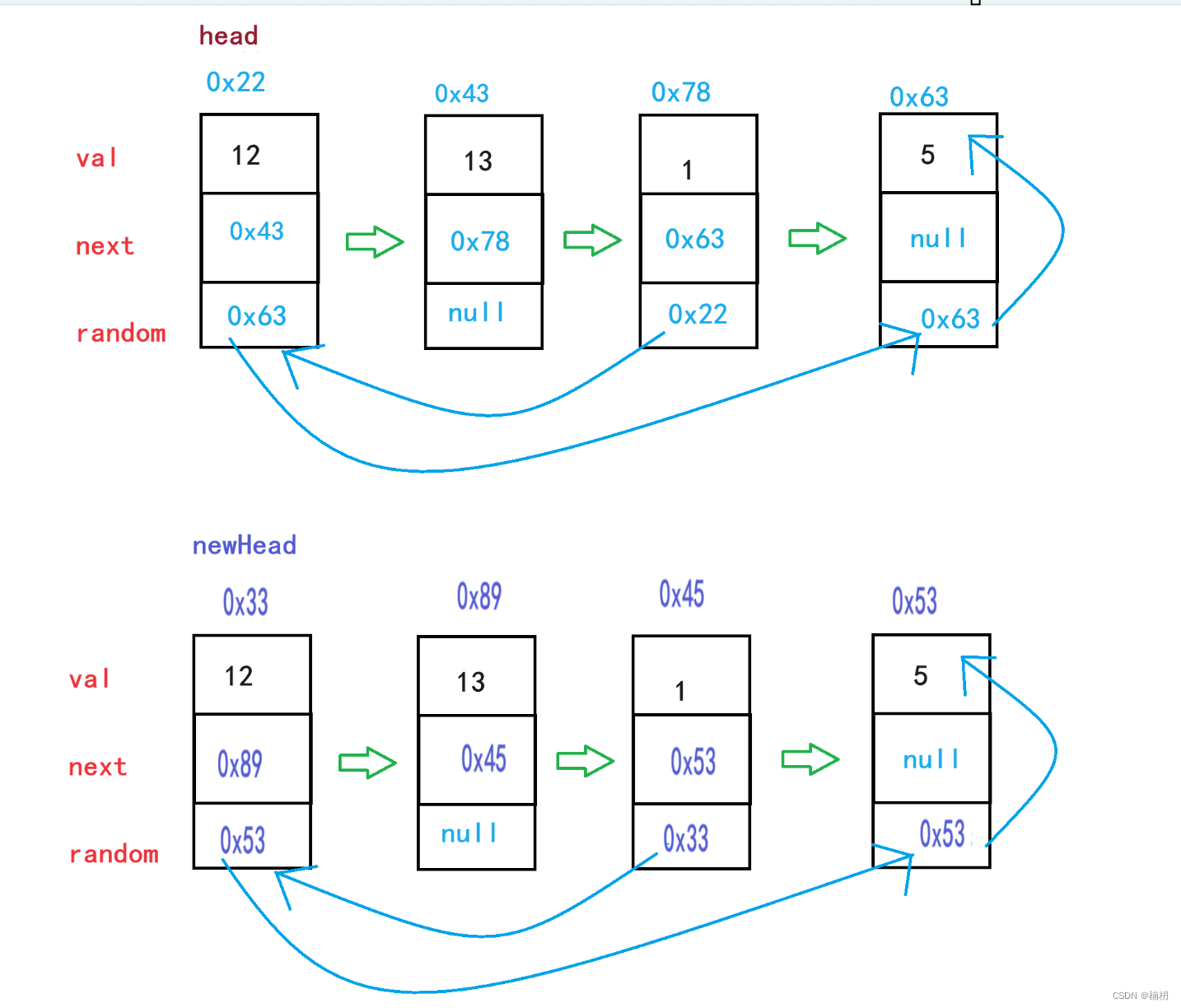 确定新链表的random:map.get(cur).random = map.get(cur.random)