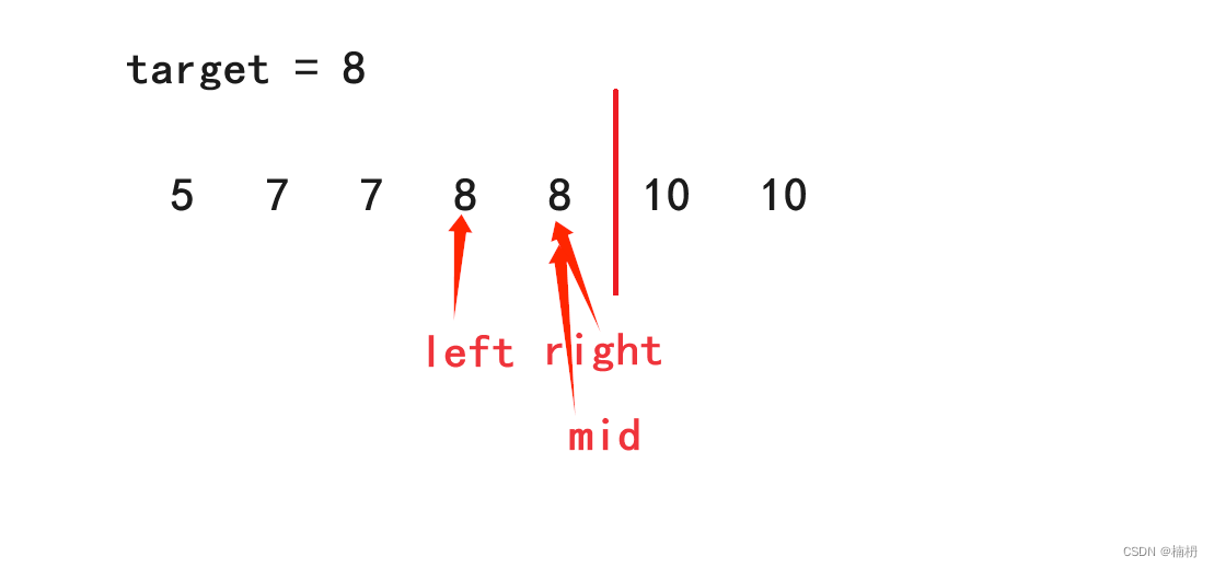若mid指向的元素落在右边区间,此时nums[mid]大于等于target,需要更新right的值,由于要找的结果(target第一次出现的位置)在此区间内,即mid所指向的位置可能就是最终结果,因此不能将right更新为mid - 1,而应更新为mid