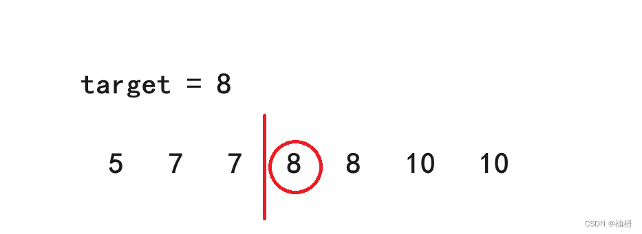 其中,左边部分为小于target的元素,右边部分为大于等于target的元素,由于右边区域大于等于target,因此右边区域最左边的值即为target第一次出现的位置,即右边区域的左端点为所求结果