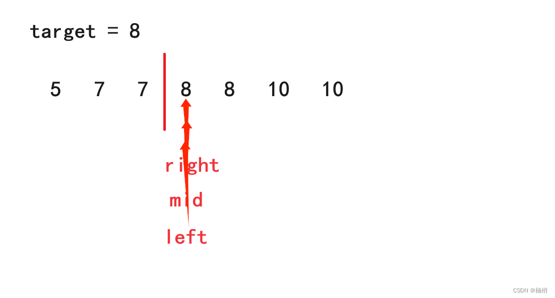 上图中,当选择右边元素作为中间元素时,mid指向的元素落在右边区间,此时将right更新为mid,再求mid,此时mid仍为指向刚才位置,即落在右边区间,此时再次更新right为mid,再次求mid... 从而死循环