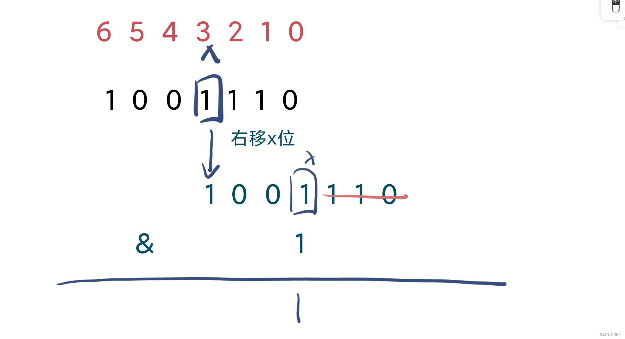 要判断一个数的第x位是0还是1,只需要将x向右移动x位(>> x),再与(&) 上1,即可判断,