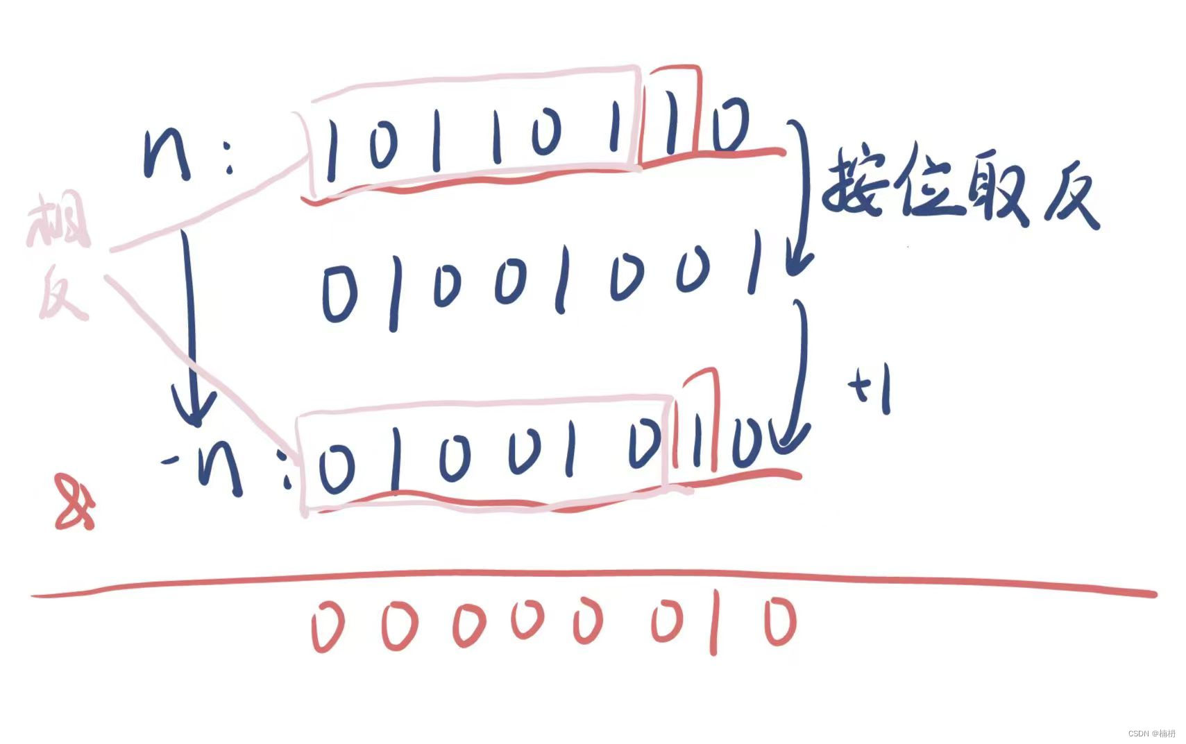 我们可以发现:将 n 转换为 -n(补码) 后,最右侧1 的左边区域(不包括最右侧1)全部变相反,此时,再将n & (-n),就只剩下最右侧的1