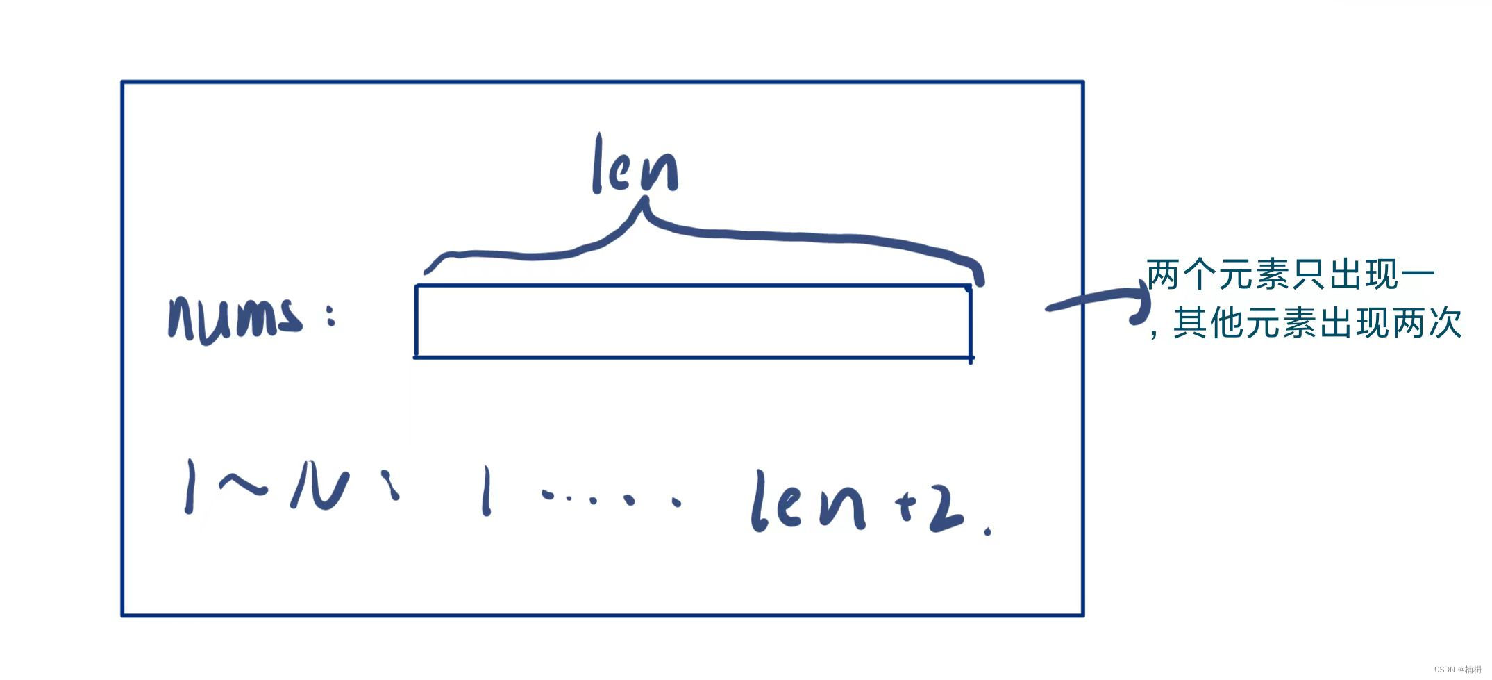 数组中缺失两个数字,设数组的长度为len,则所有元素为1 到 len+2,由于其中缺失两个数字,若将数组中所有元素和1 - len + 2看做一个整体,则此时就变为两个数字只出现一次,其他数字出现两次,此时就和 只出现一次的数字III 相同了,接下来按照 只出现一次的数字III 的解题思路来解题就可以解决该问题