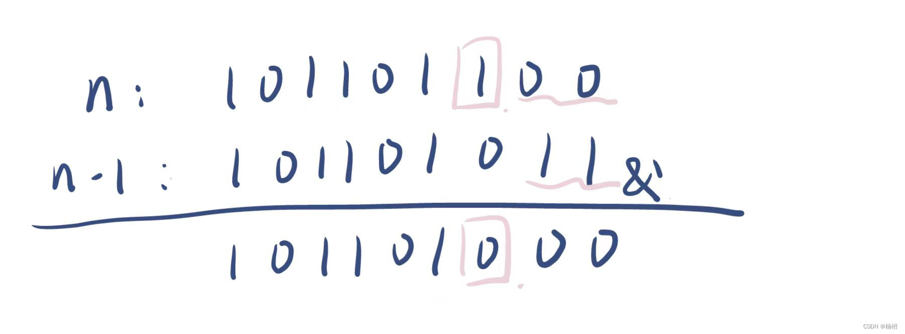 我们可以发现:将 n 转换为 n-1 后,最右侧1 的右边区域(包括最右侧1)全部变相反,此时,再将n & (n-1),就能够去掉最右侧的1了