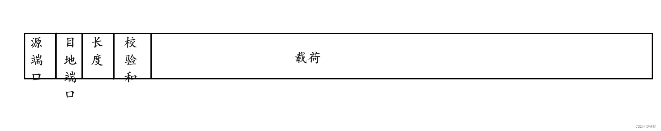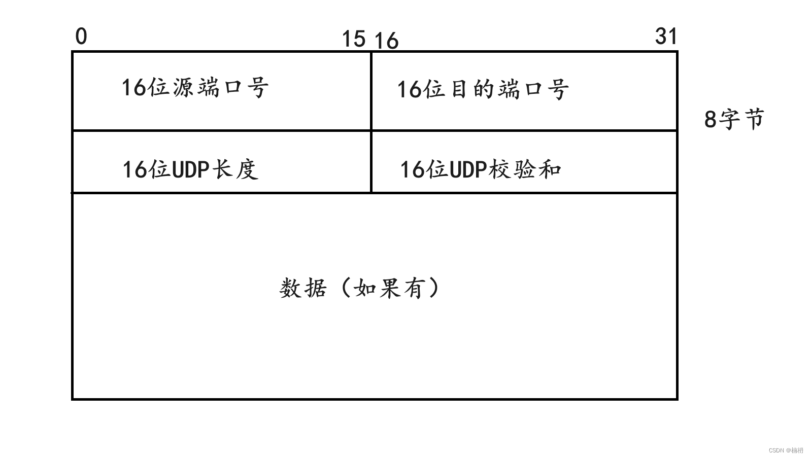 其中UDP报头中一共有 4 个字段,每个字段 2 个字节(因此一共 8 字节)