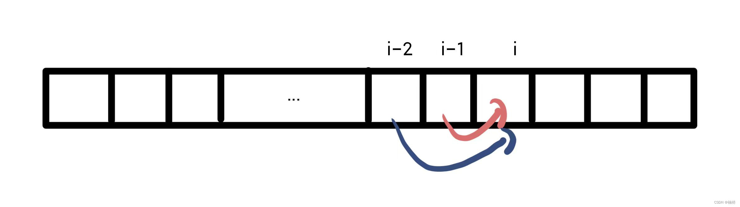 同理,从i-2位置到达i位置时最小花费为dp[i-2],则从 i-2 位置到达i位置的最小花费为 dp[i-2] + cost[i-2]