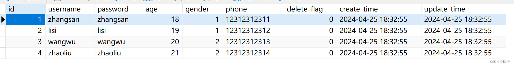 VALUES ( 'zhangsan', 'zhangsan', 18, 1, '12312312311' );