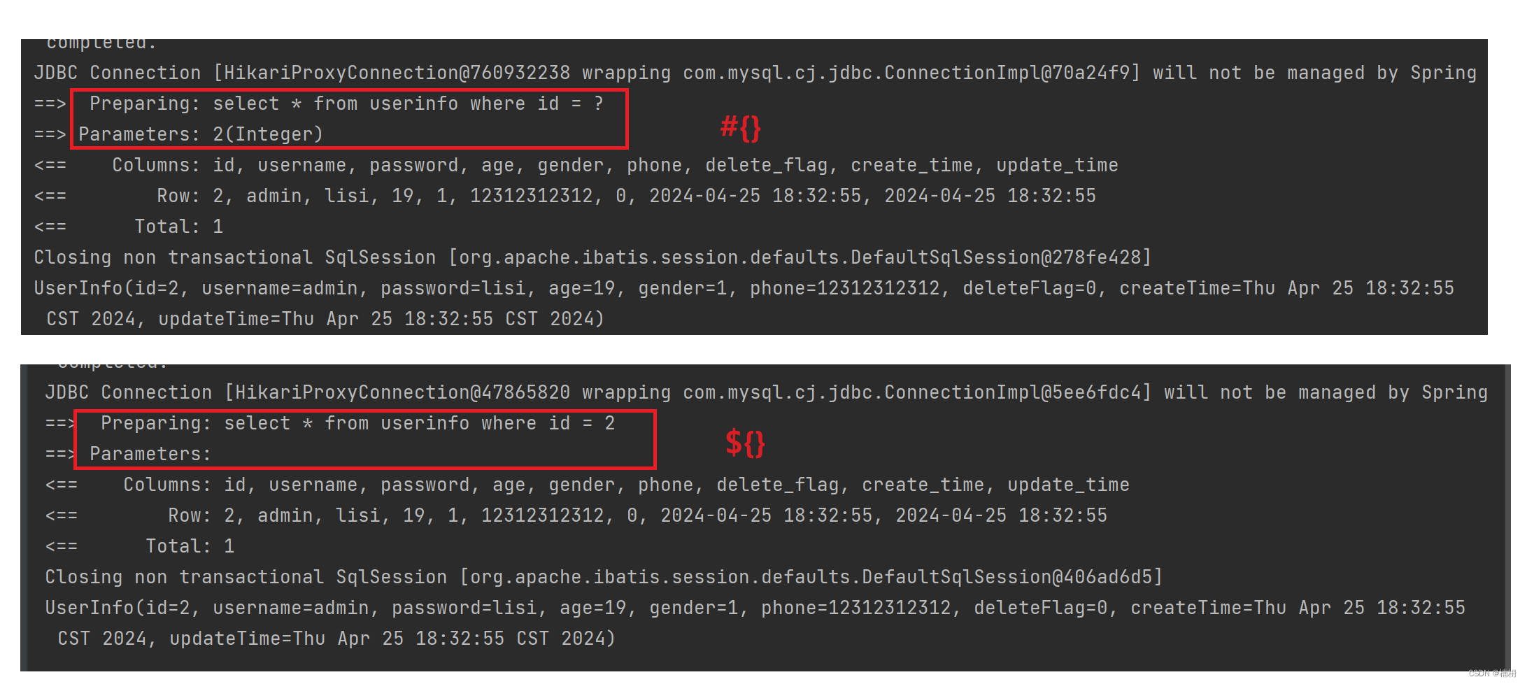 我们可以发现:当我们使用 #{} 时,输入的参数并未在后面之间拼接,而是使用 ? 进行占位,这种SQL称之为"预编译SQL",而当使用 ${} 时,输入的参数直接拼接在后面